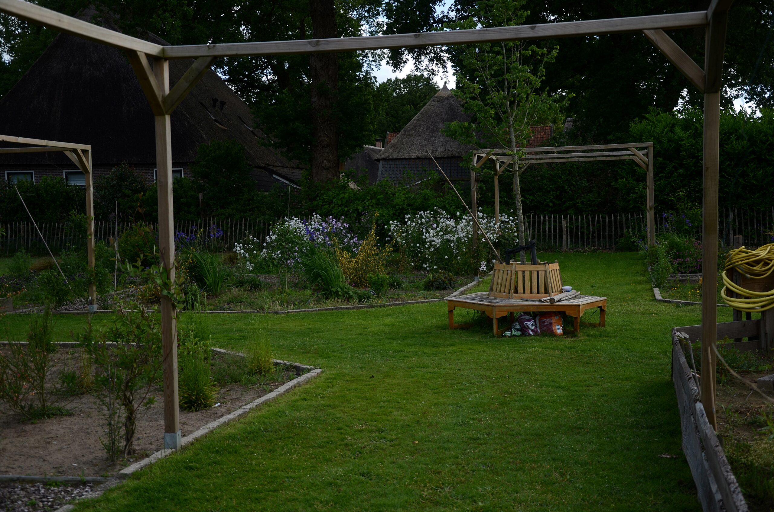 Een vast omlijnd tuinplan was er aanvankelijk nog niet. Al scheppend ontstonden er steeds weer nieuwe ideeën waarop verder geborduurd wordt. Wat in het oog springt zijn de grote overkappingen, waarop zonnepanelen zijn geplaatst. Ook komt er nog een lucht/water warmtepomp; dus van het gas af!