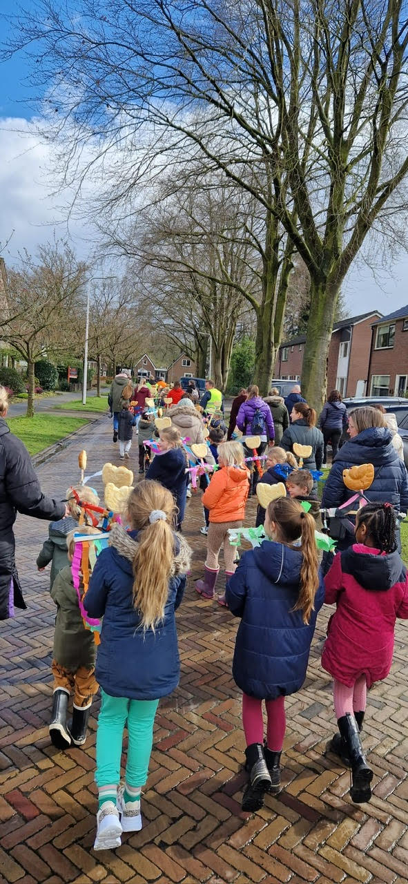 Alle kinderen, al dan niet geholpen door ouders en enkele oma’s, deden ontzettend hun best om er iets moois van te maken. Na een glas ranja en iets lekkers, kreeg iedereen een broodhaantje voor boven op de stok.