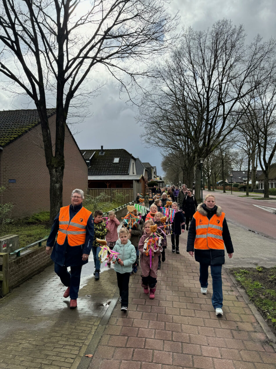 Bijna 45 kinderen van de basisscholen en ouders kwamen om 13.00 uur bij De Drieklank op de been voor de traditionele palmhaanoptocht, die werd georganiseerd door de Activiteitencommissie van Dorpsbelangen Aalden.